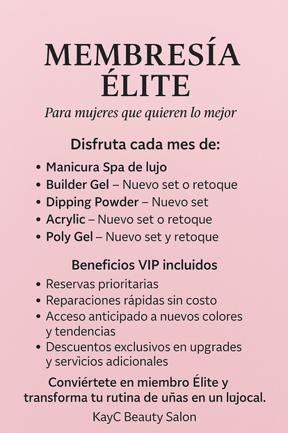 La Membresía Élite es la experiencia más completa y exclusiva de KayC Beauty Salon. Diseñada para mujeres que aman lucir impecables todo el mes, esta membresía te da acceso a los servicios más premium del salón, prioridad en citas y beneficios que NO obtienen las clientas regulares.
